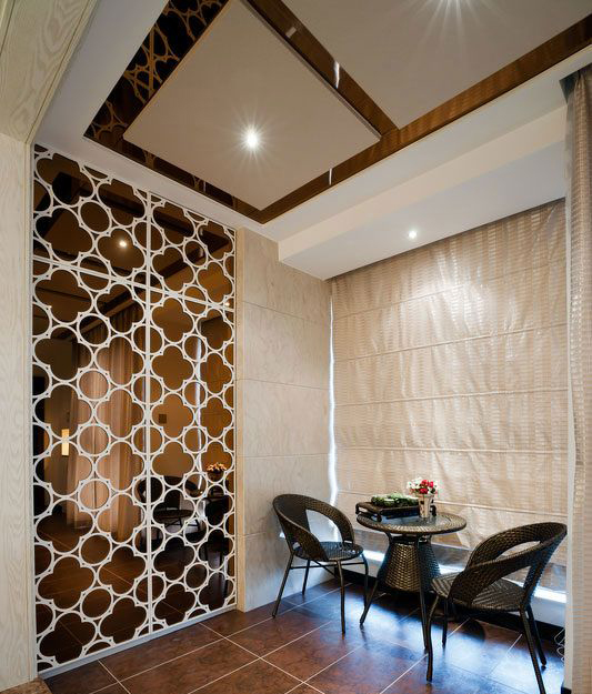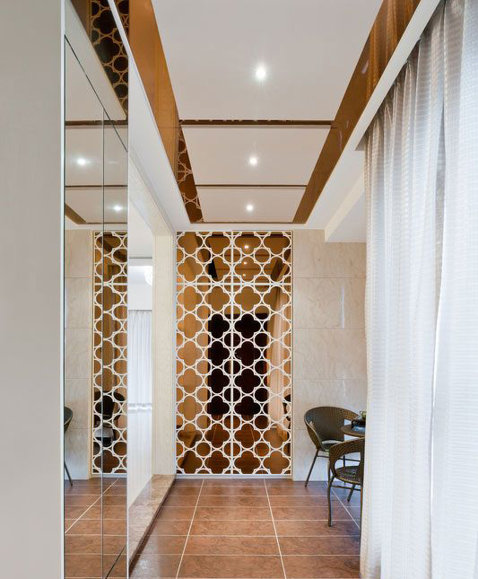 接手本案例時業主工程已經進行到木作。整個空間設計上只能不改動原有的大體格局的情況下,在后期的木作和軟裝去調整,設計手法的運用上試著用純粹干凈的線條搭配出溫馨柔和的自然色調。原有的入戶空間與餐廳空間、客廳背景與洗手干區在造型、色彩與材質上相互的銜接,讓空間巧妙融合。入戶玄關的暗門上運用了密度板的樓花造型,深色茶鏡在樓花的造型映襯上顯的格外的靈動。并于吊頂相互的銜接,使得天花的視覺上有了無限延伸效果,餐廳處備餐柜兼具實用與隔斷功能,周邊的柱子運用透光云石的修飾,備餐柜成為了餐廳空間的主軸。客廳空間電視柜的石頭臺面貫通至洗手臺處,高低錯落感讓臺面凸顯出層次。削弱了單一感。幾只蝴蝶的掛簾給空間帶來了生活的情趣感。