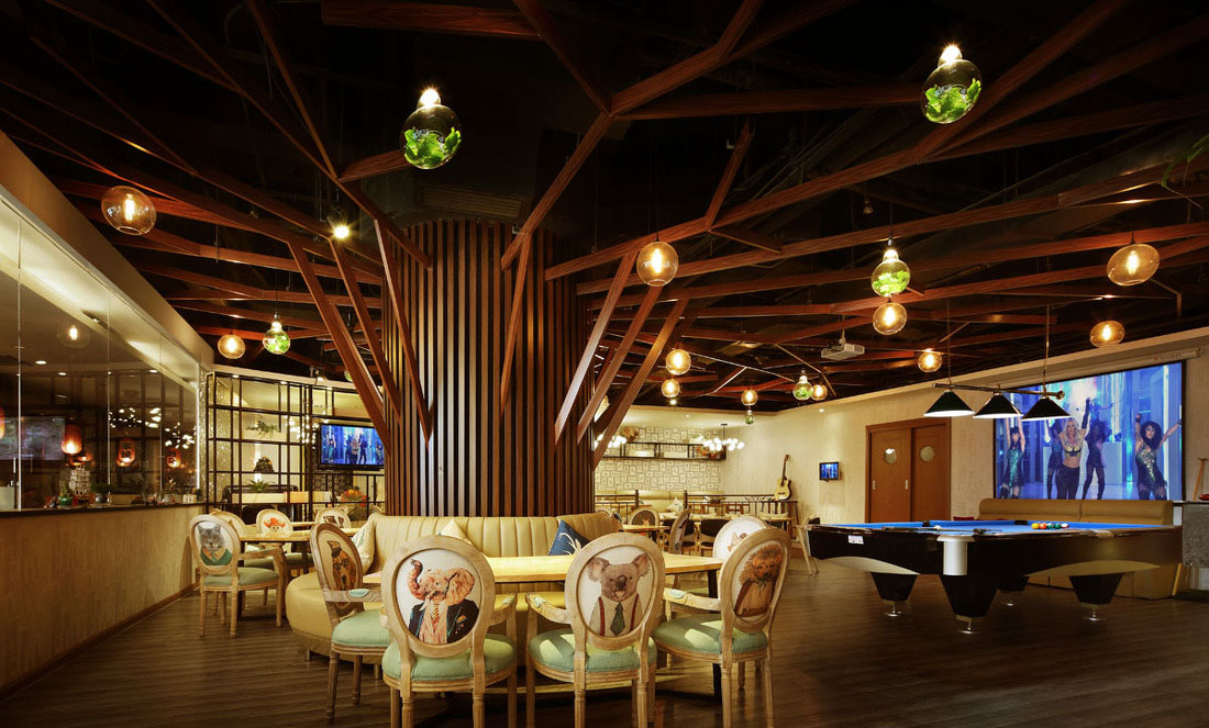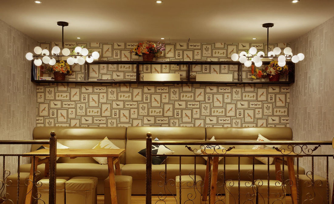 原來(lái)的棋牌室地面抬高,入口處加了地?zé)簦瑝γ妾?dú)特挑選的墻紙和色彩的乳膠漆裝飾,原來(lái)的沉悶感一掃而空。在酒吧一角增加了駐唱的位置和投影儀,在這里有歌手的專(zhuān)業(yè)演繹,客人沉醉在音樂(lè)中,讓人流連忘返。另外為了空間更加豐富,我們?cè)诖髲d抬高了兩塊位置,用鐵藝欄桿和隔斷區(qū)分空間,特別定制的木格則讓空間增色不少。