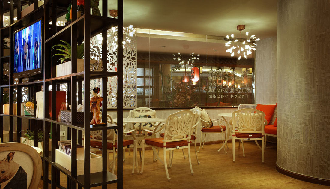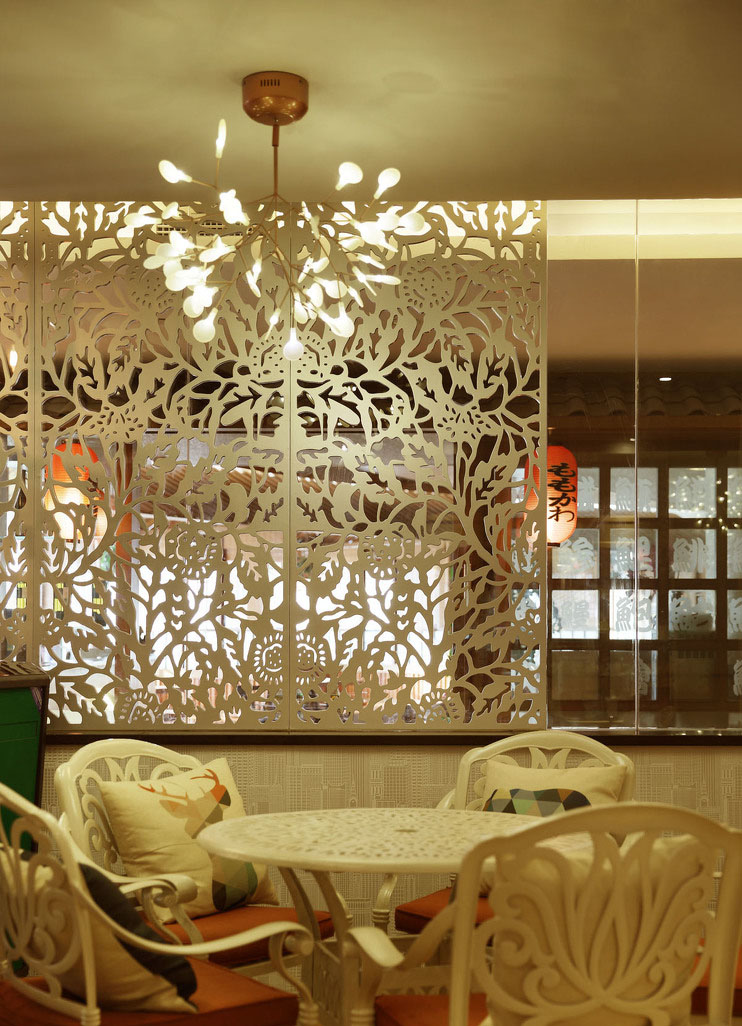 我們將原來(lái)的室內(nèi)裝修拆除,大廳中間的混凝土圓柱是較難處理的。直徑約1.6米的圓柱占住了大廳相當(dāng)一部分空間。設(shè)計(jì)師動(dòng)了一番心思,圍繞圓柱布置沙發(fā)卡座,用木紋的鋁合金方通將圓柱裝飾起來(lái),并延伸到天花上,四處發(fā)散,如同一棵參天大樹(shù),根深葉茂,天花上再裝飾一些玻璃圓球燈,圓球立面有綠色植物裝飾,使得整個(gè)空間一下子活躍起來(lái),原來(lái)作為障礙的圓柱變成了整個(gè)空間最濃筆重抹的部分。家具是設(shè)計(jì)師幫助挑選和購(gòu)買(mǎi)的,力求和空間水**融,每個(gè)靠背和抱枕都有不同的圖案花紋,彰顯出細(xì)節(jié)的追求。